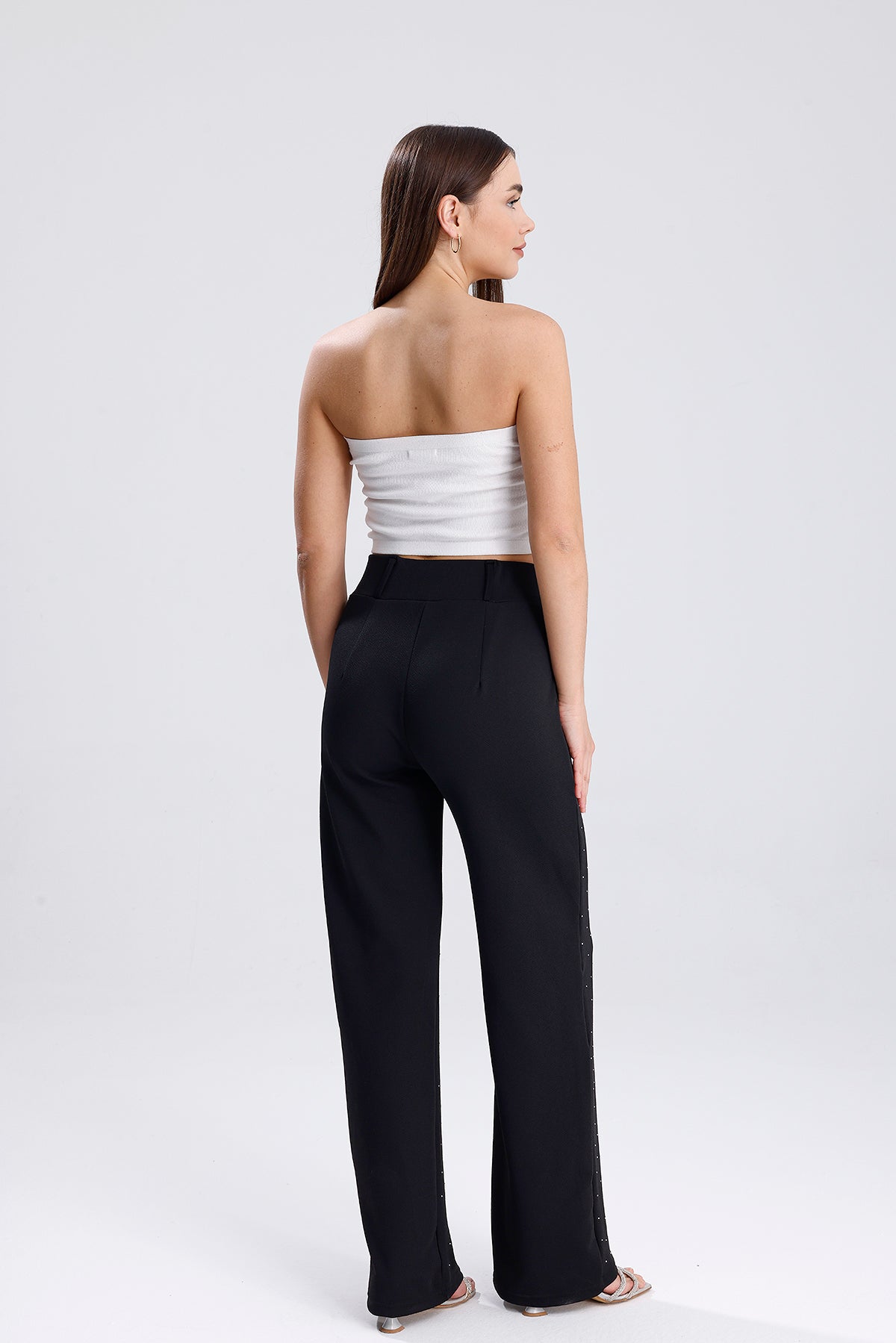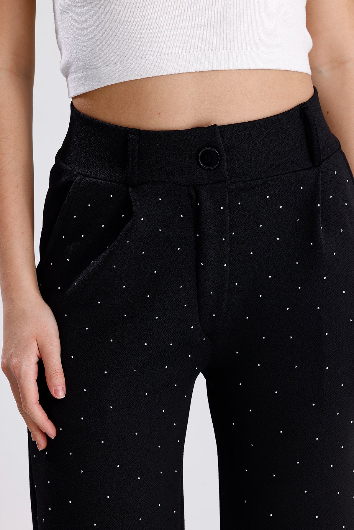- Şık ve modern tasarımıyla dikkat çeken siyah taşlı palazzo pantolon, genç stil sahibi kadınların gardırobunun vazgeçilmez parçasıdır.